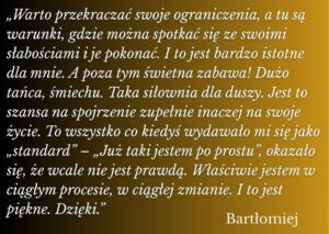 Te 6 poziomów to baza, nasze nowe narodziny do świadomego życia. Pracujemy w jednej grupie i każdy może dotrzeć do totalnej i realnej zmiany w sobie. Każdy bierze odpowiedzialność za swoją przemianę i ten akt wzięcia odpowiedzialności za swój własny proces transformacji buduje poczucie mocy